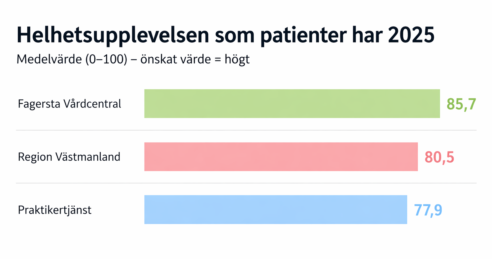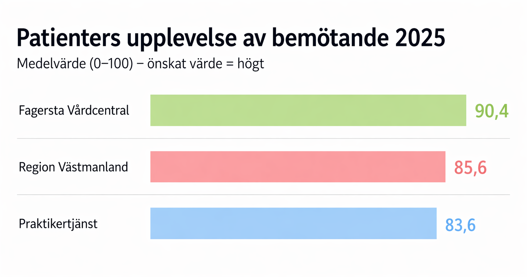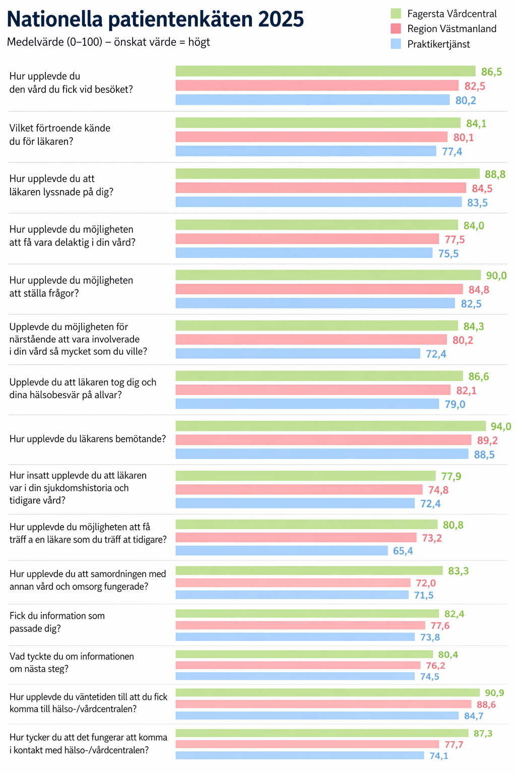 Här presenterar vi ett urval av resultat från en undersökning om hur patienter upplever besök på hälsocentraler och vårdcentraler. Undersökningen är en del av den nationella patientenkäten 2025 och bygger på patienters egna upplevelser av vården i hela landet. Resultaten som visas här gäller Fagersta Vårdcentral Svenska Kyrkan, Praktikertjänst Vårdcentralen i Fagersta samt Region Västmanland, vilket ger en jämförelse på både lokal och regional nivå.