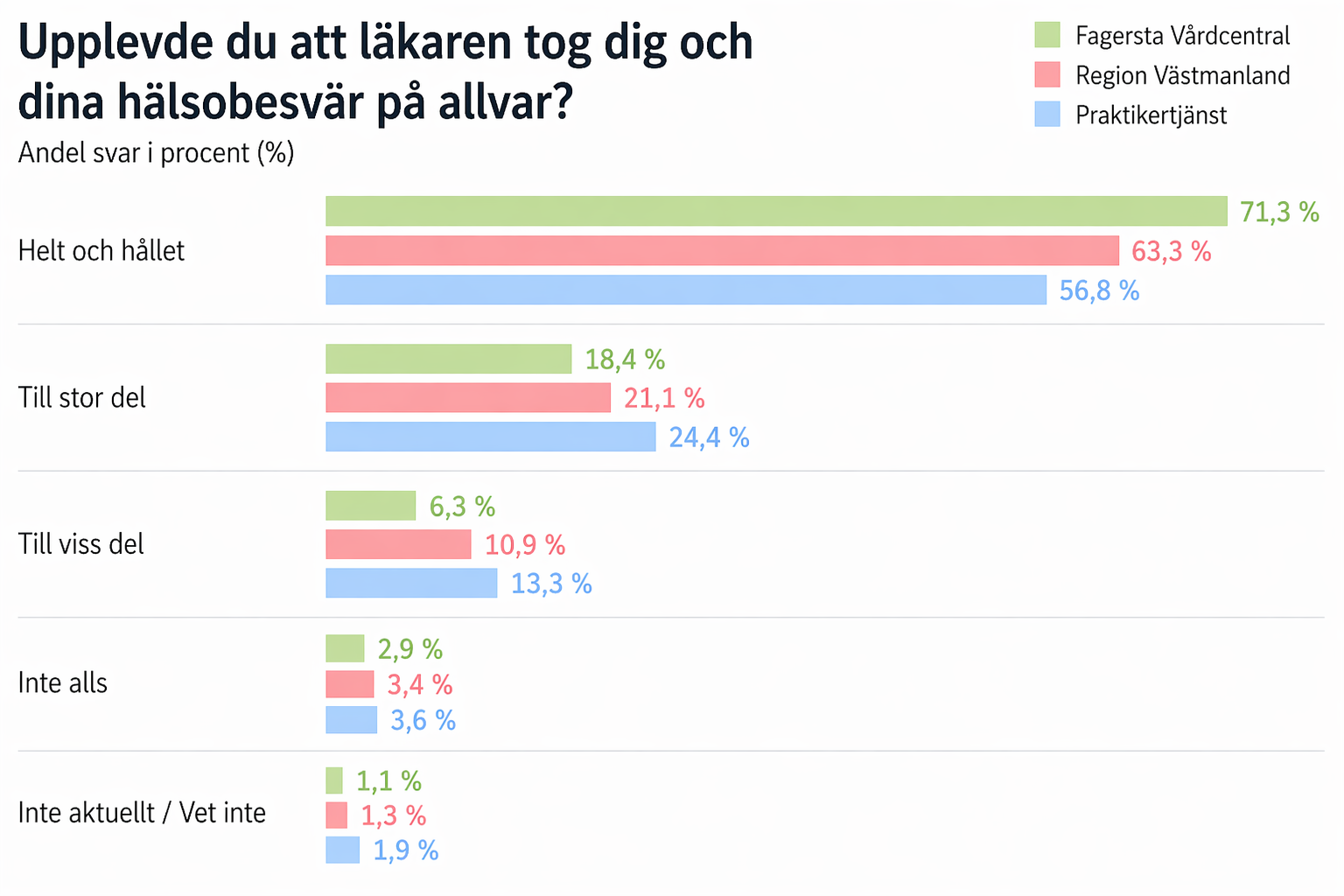 Så svarade patienterna på frågan om de upplevde att läkaren tog deras hälsobesvär på allvar under vårdbesöket. Andel svar i procent (%).